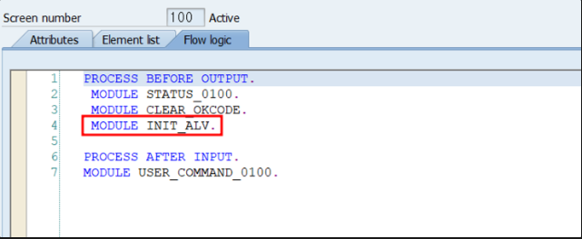 1. 100번 스크린의 Flow Logic에 모듈을 입력하고 생성합니다.